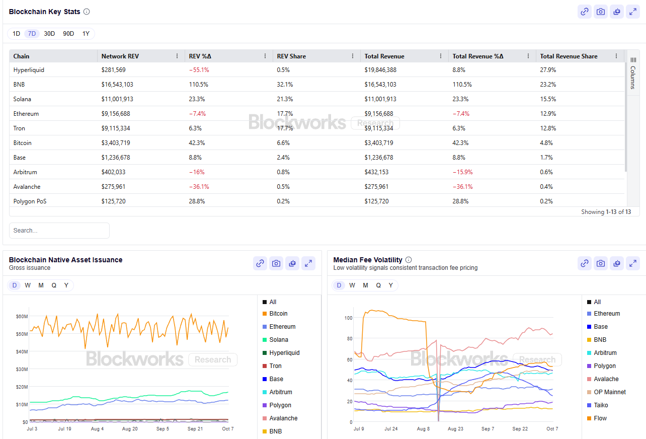 What is it: Blockworks’ Chain Comparison is a live analytics dashboard that tracks and visualizes real-time onchain metrics — including fees, revenue, staking, and token issuance — across top blockchains like Ethereum, Solana, Base, Arbitrum, Avalanche, and more.
