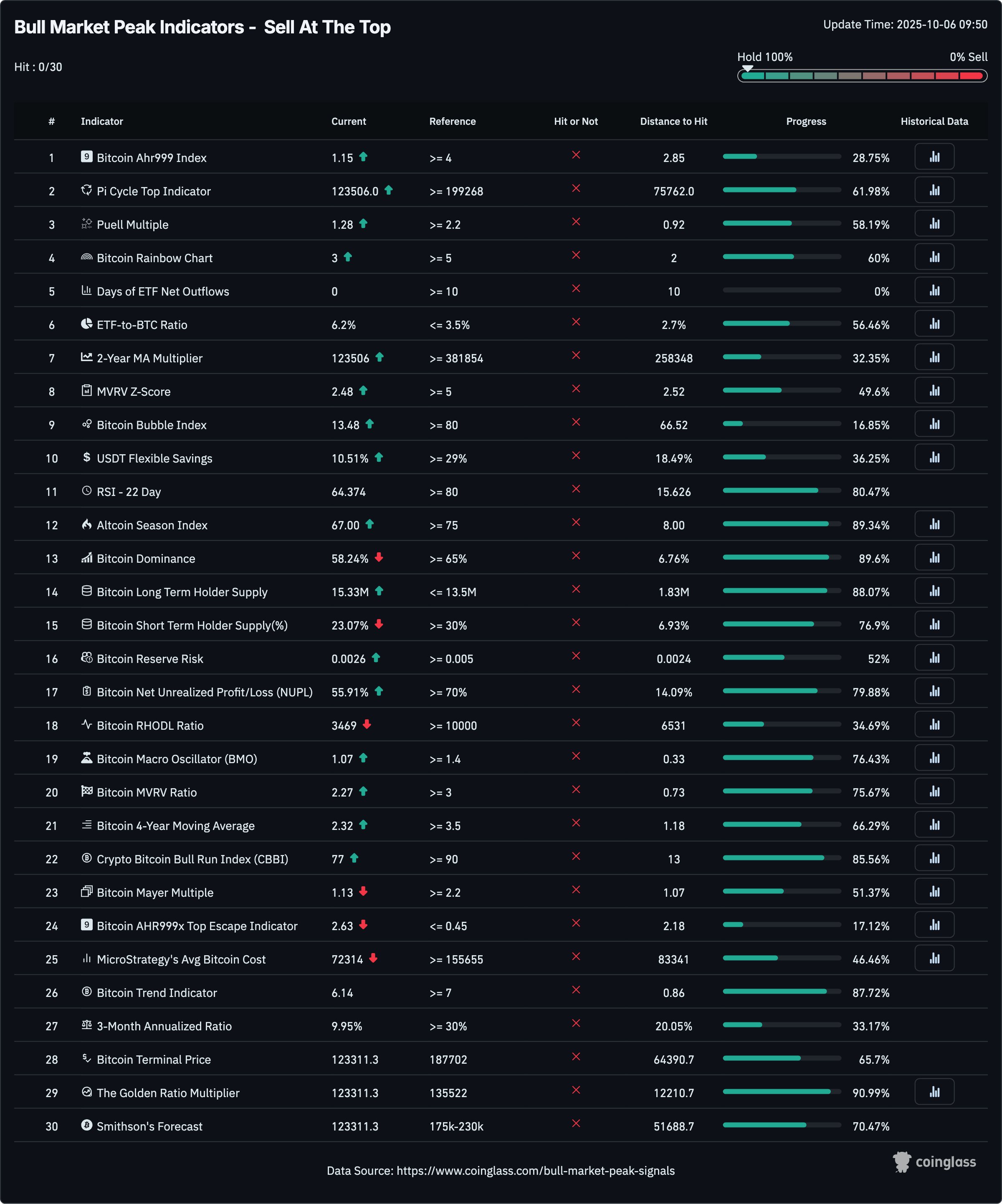 CoinGlass Bull Market Peak Signals helps traders track 30 key crypto cycle indicators in one dashboard to spot when Bitcoin is nearing its market top.