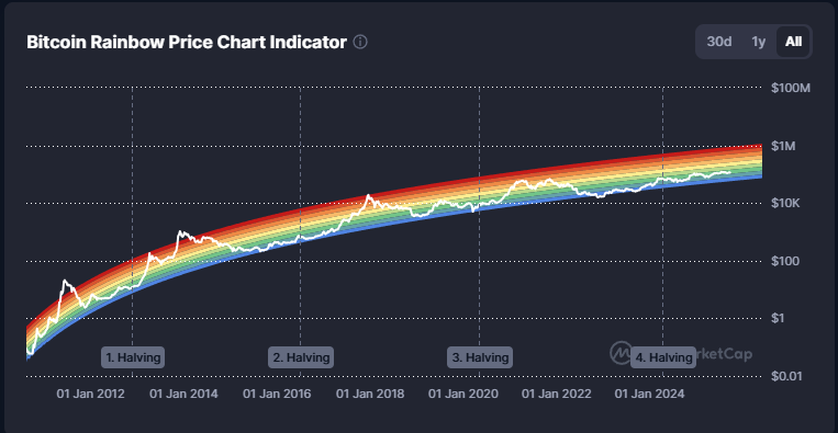 - Bitcoin Rainbow Chart – Suggests long-term BTC valuation bands.