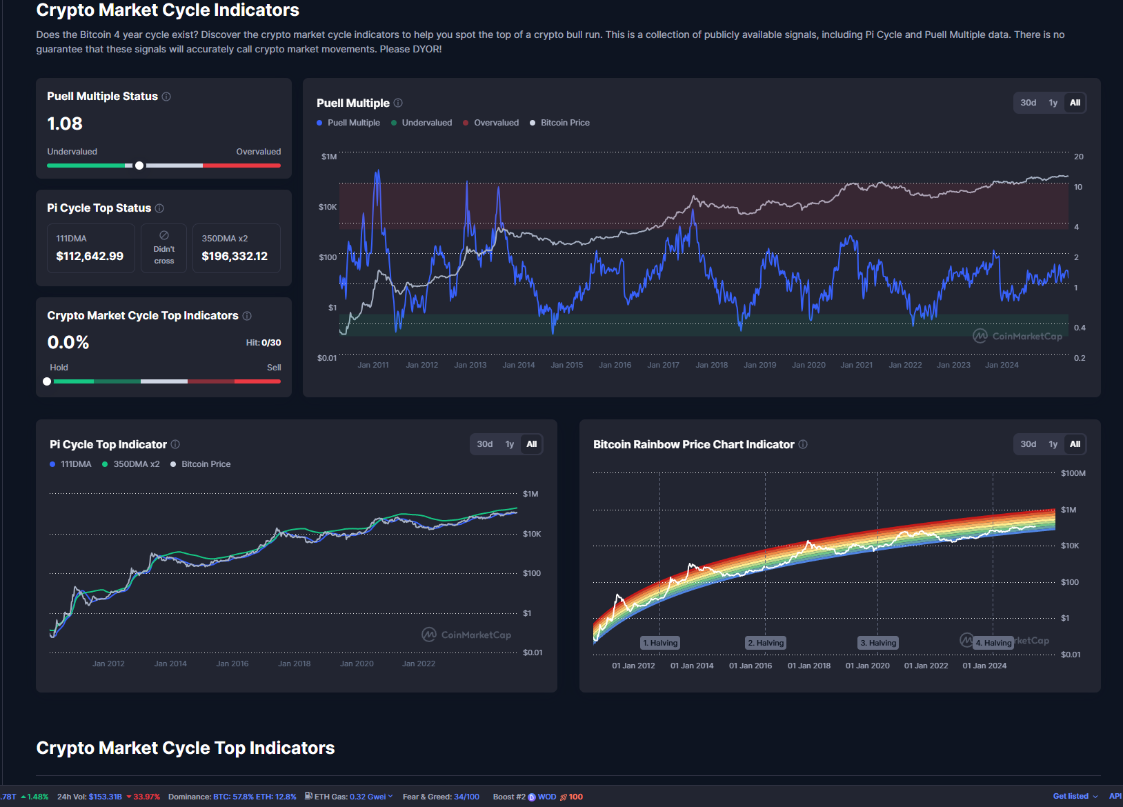 The Market Cycle Indicators tool on CoinMarketCap tracks multiple metrics designed to give insight into where the market might be heading. Instead of analyzing charts manually, this tool shows whether each indicator has been triggered.