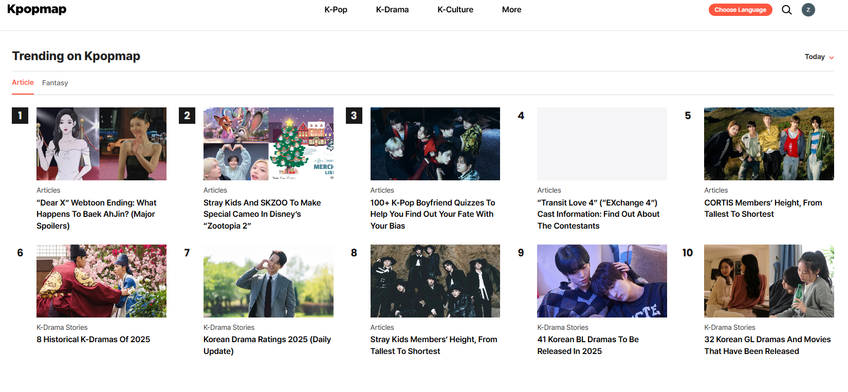 Kpopmap isn’t just a news digest — it also offers real‑time fan charts (for idols and groups), interest indices based on social engagement, and global coverage in multiple languages.