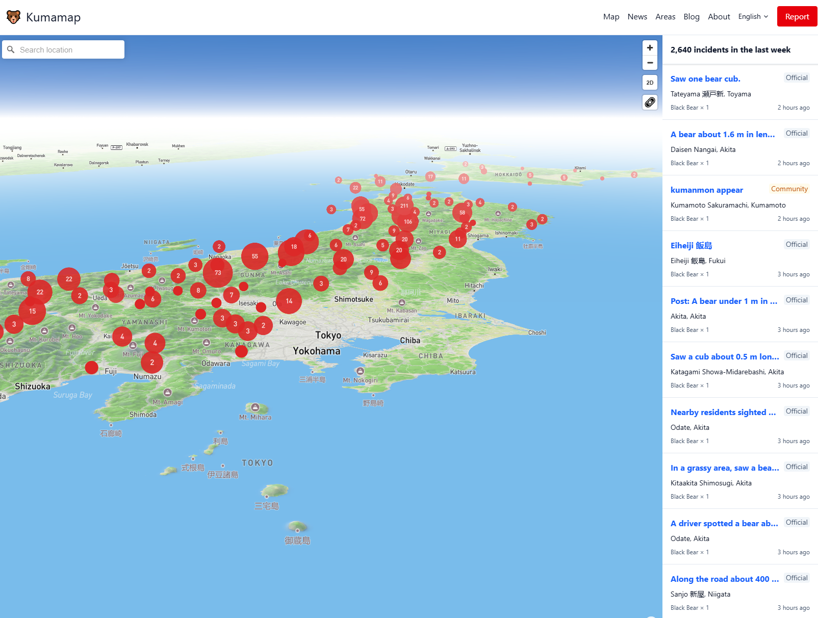 Kumamap is Japan’s centralized bear incident tracking platform, built to unify and translate wildlife encounter data from over 30 prefectural government sources. It’s the most reliable hub for monitoring bear sightings, attacks, and encounters across the country — all visualized on an interactive map.