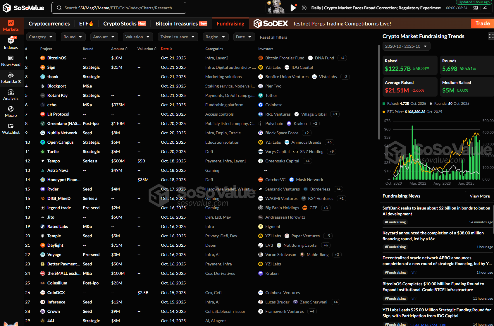 SoSoValue offers a dedicated “Fundraising” section where you can explore data on crypto funding rounds from 2020 to 2025—including total amounts raised, number of rounds, average size, and details of individual projects. For example: the dashboard shows $122 B+ raised across 5,689+ rounds in the timeframe.